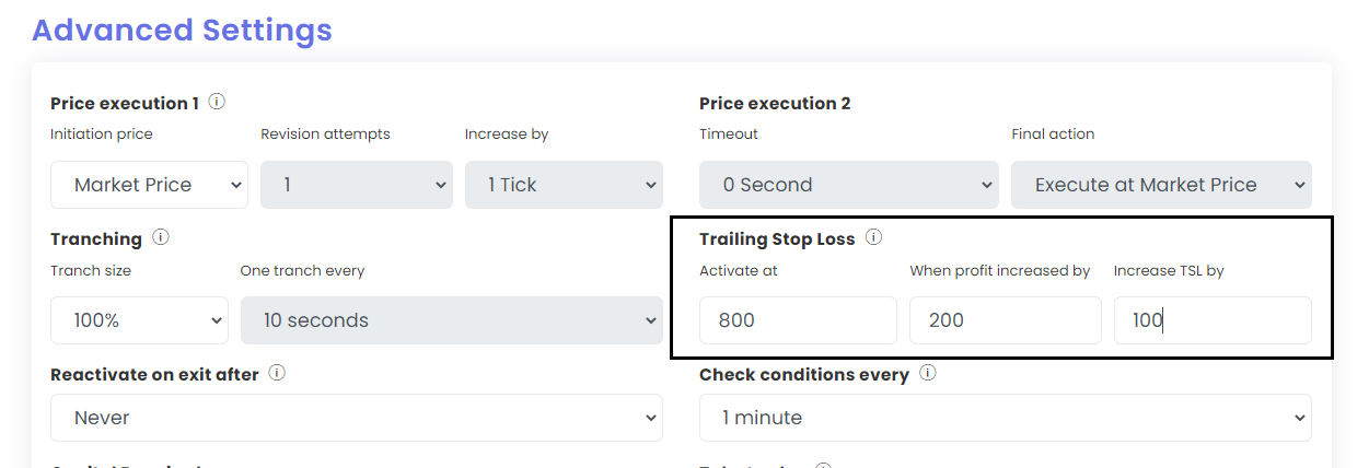 The trailing stop loss (TSL)can be found in the advanced settings of the strategy creation page of Tradetron.